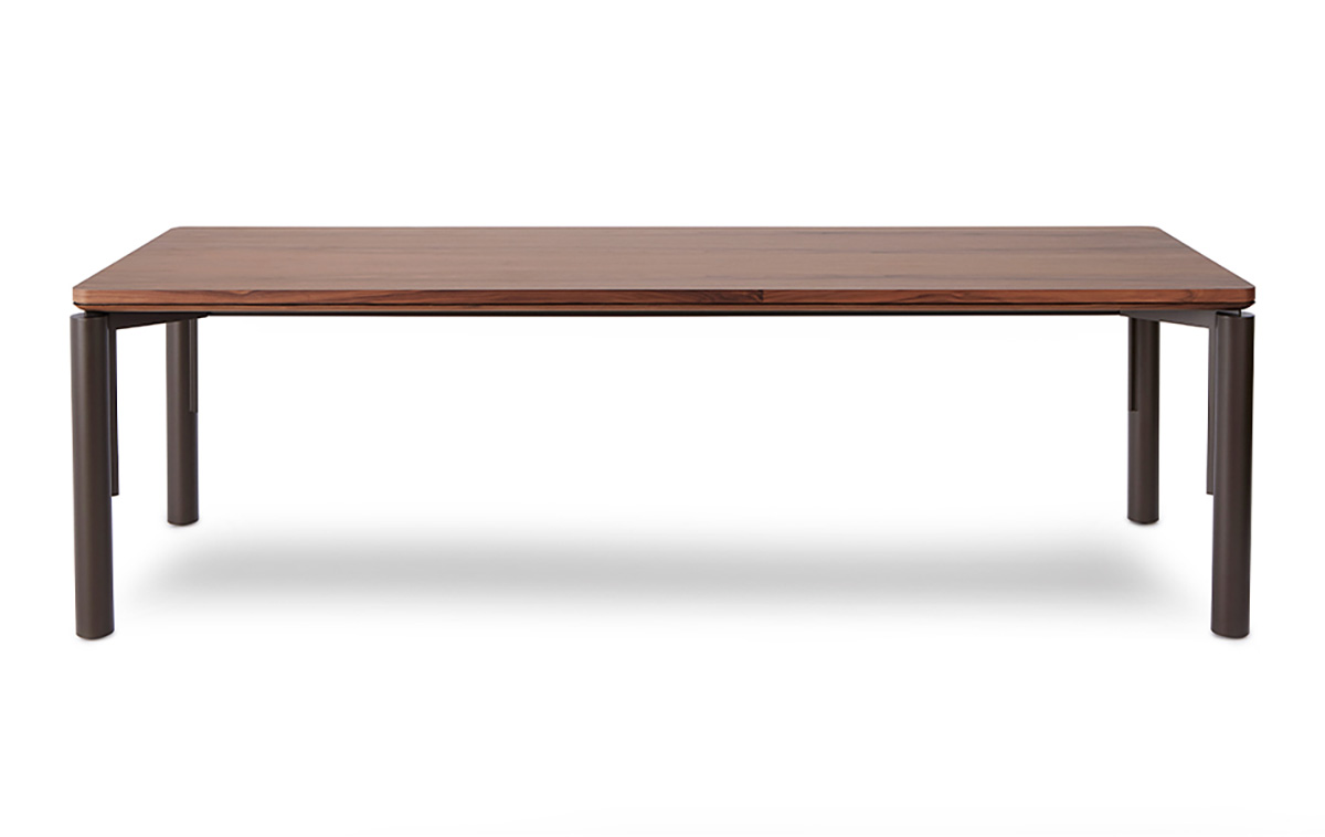 Uma mesa de jantar com pegada industrial e toque aconchegante. A estrutura robusta assume o protagonismo e cria um jogo entre força gráfica e equilíbrio visual. O tampo, em lâmina de madeira, laca ou vidro, convida ao toque e completa essa síntese contemporânea de materiais e expressividade.