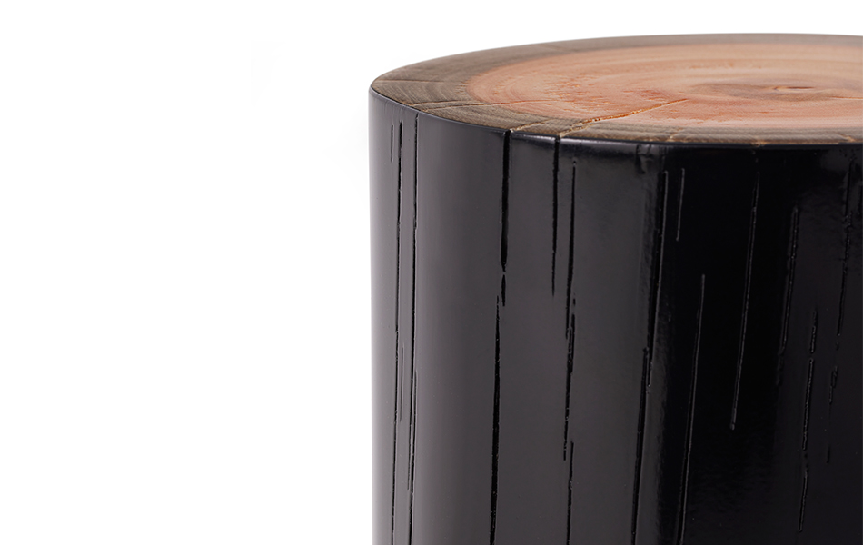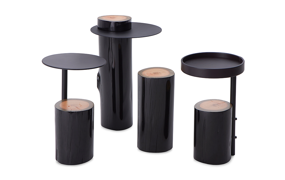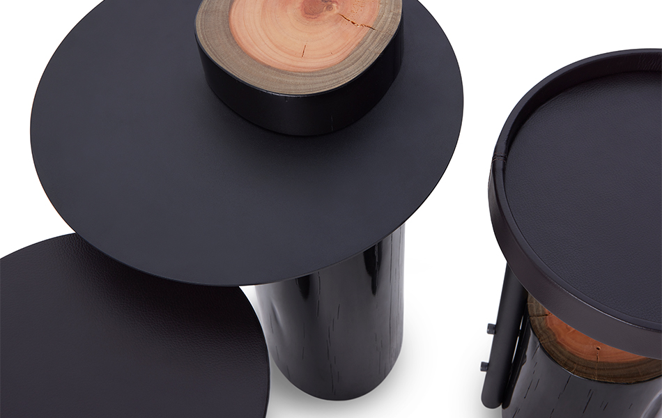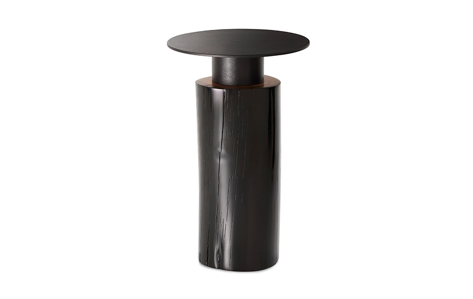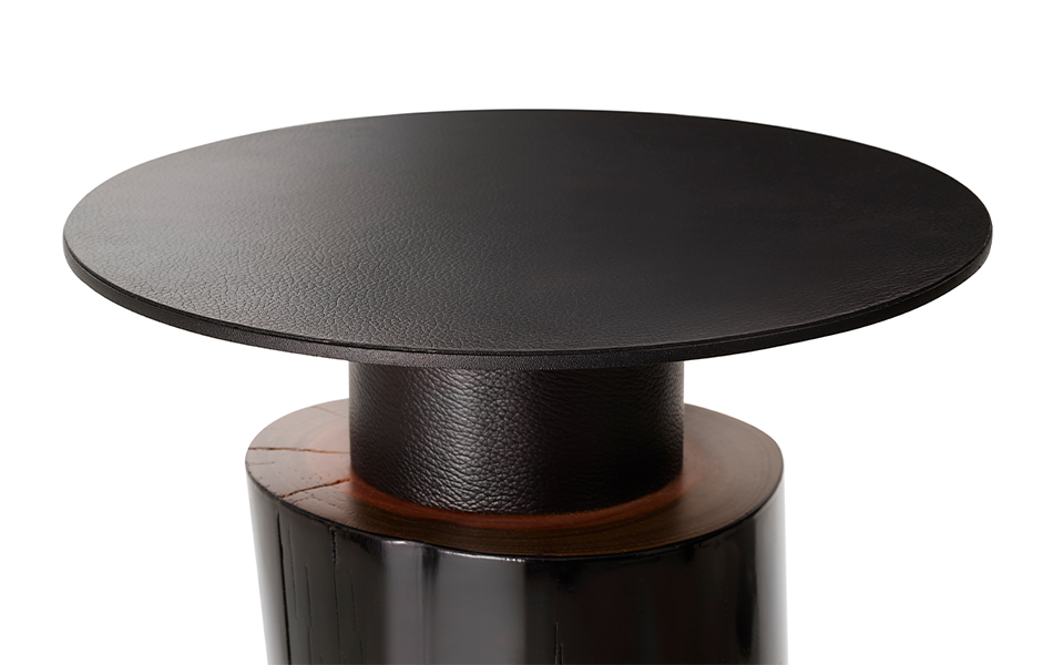 A intervenção avança numa mesa de apoio menor, o couro natural aquece a superfície e reforça o contraste.