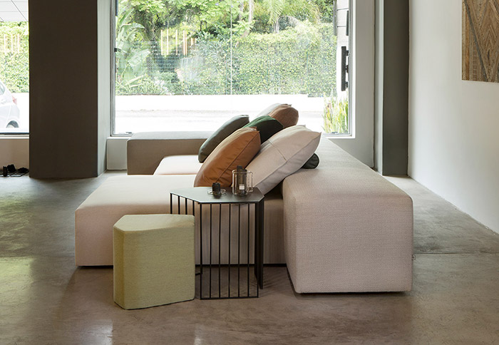 composição com os pufes C349, seu desenho geométrico é ideal para uma decoração inquieta, que evita seguir