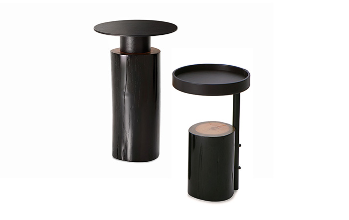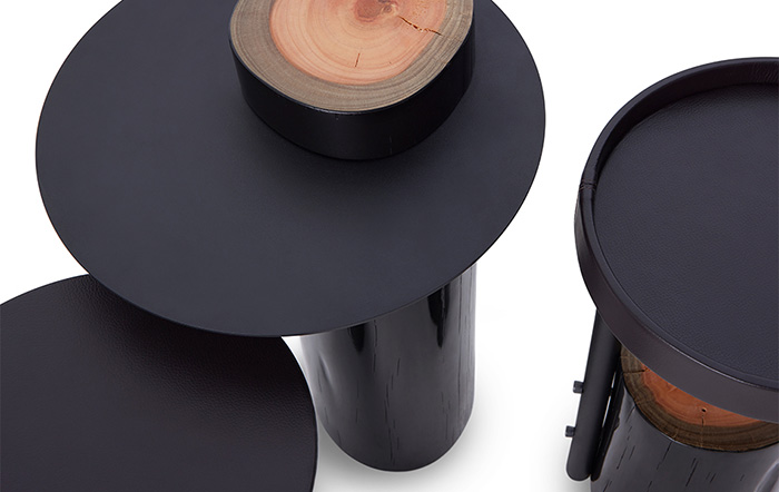 As mesas C402 e C403 são o segundo ato do corte. A transformação da natureza é ampliada: tampo com ou sem bandeja, fixações aparentes e opções em couro. A intervenção humana se intensifica, estrutura a função sem apagar o gesto. Preservam a origem e aprofundam a transformação.